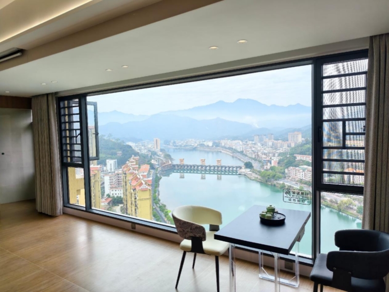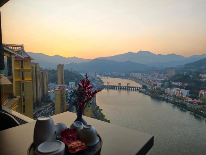 四间客房,每间都有景。最大的一间做了整面落地窗,正对九龙江,整个县城尽收眼底,九龙江穿城而过,波光粼粼的江面上倒映着两岸的霓虹。远处,坝头桥和城东桥两座桥梁横跨江面,车流如织,灯光璀璨。