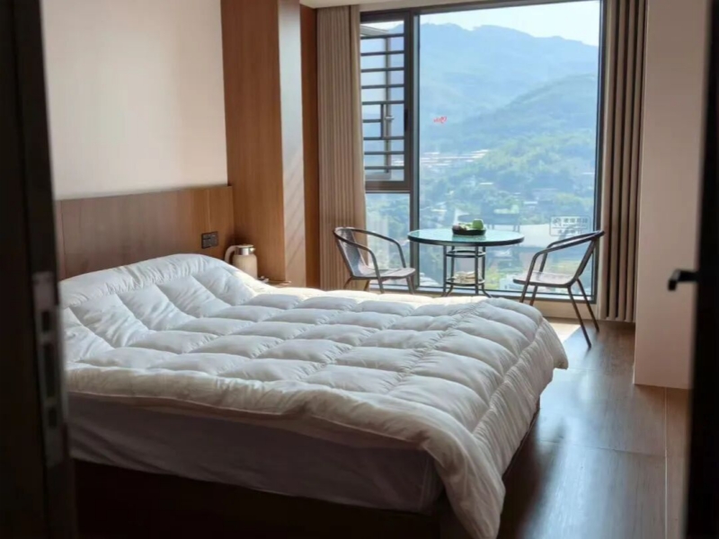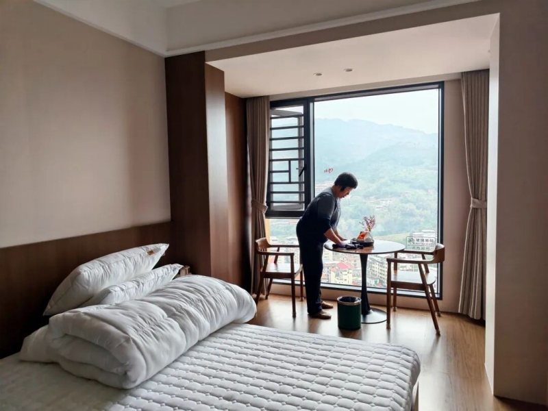 最大的心思花在景观上。为了把最好的视野留给客人,他们坚持做落地窗,为此放弃了一套更便宜的2楼房子。“2楼隐私太差,如果做落地窗,小区、街边抬头就能看见房间。顶楼不一样,俯瞰和远眺,完全是两种体验。”装修材料全部按家装标准,用时半年左右,去年12月完工。