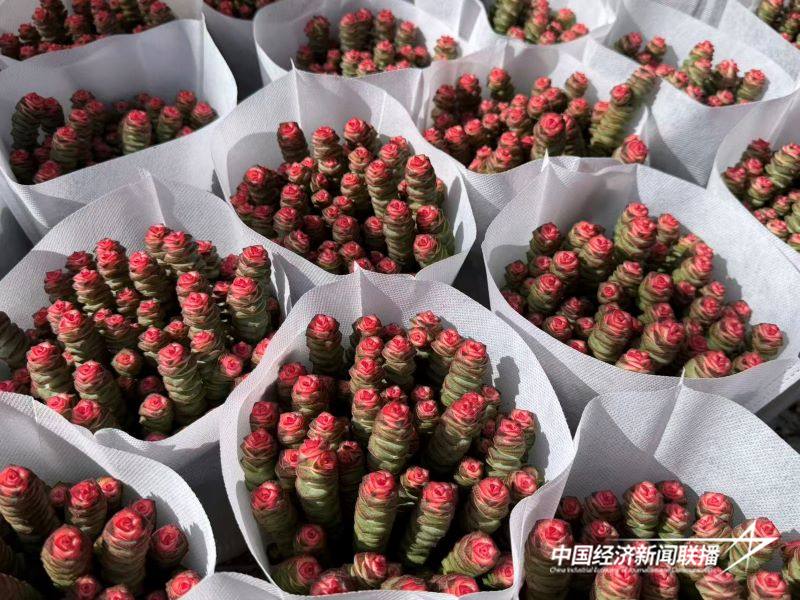中经联播昆明讯【王东琴 融媒体记者曲乐 邢雪婷 陶佳佳】银浪铺田,萌趣满棚。在云南省昆明市禄劝彝族苗族自治县永善村,10万平方米连栋温室大棚整齐排列,宛如银色长卷铺展于田野之上。棚内,上万株“钱串锦”多肉饱满鲜嫩、层层叠叠,以萌态勾勒出别具一格的田园景致;棚外,工人们熟练选品、分装、打包,一箱箱色彩缤纷的多肉植物从这里启程,发往全国,更远销东南亚、韩国、日本等国家和地区。 这座由昆明舒升农业发展有限公司投建的多肉种植基地,自2017年落地以来,以特色产业为抓手,构建起“公司+基地+农户”联农带农新模式,让小小多肉成为助力乡村振兴的“致富花”,串起村民增收的千万好“钱景”。
