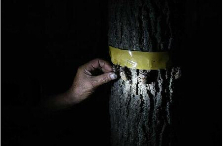 最近,在安徽省六安市苏家埠滩上,数千棵白杨树都被裹上胶纸。居民晚上都打着手电筒捉一种叫做“知了猴”的虫子。光滑宽大的胶纸粘住白杨树一米高的部位,傍晚,“知了猴”出土后本能地往树上爬去,爬到被胶纸粘住的地方,由于胶纸比较滑,再也爬不上去了,被围堵的知了猴就这样聚集在树体的四周。