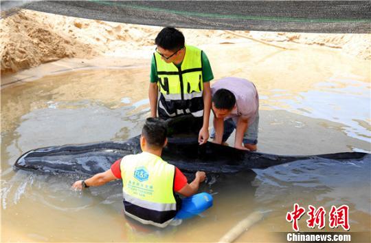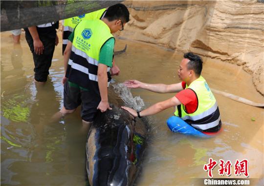 救护专家人员为鲸鱼泼水维持体表温度。陈思国 摄