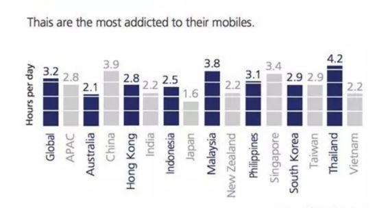 在去年特恩斯市场研究公司(TNS)给出的一份研究报告显示,在全球16-30岁之间的用户中,用户每天平均使用手机的时间为3.2小时,而国内用户平均每天使用手机的时间为3.9小时,远超过全球平均水平,仅次于排名第一的泰国(4.2小时)。对于3.9小时来说是一个什么概念我们来算一下,以每天工作 (8小时)、睡觉(8小时)、吃饭(1.5小时)、上下班路程(1.5小时)的时间来计算,每天只有5个小时的休闲时间,可见玩手机所占比例之高。