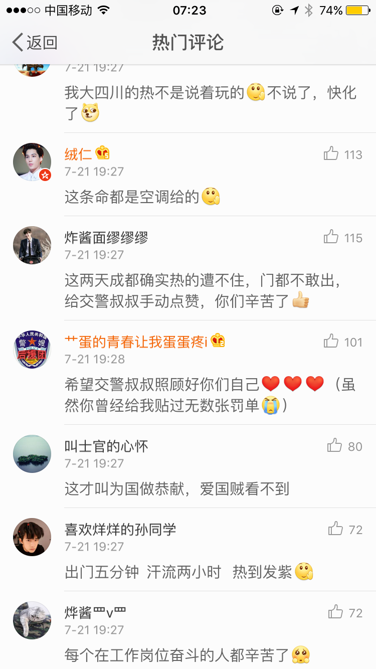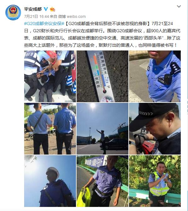 随后,@平安成都 又更新一条微博,配图不仅有早前连长,还有更多奋斗在一线的执勤警察照片,并配文称:“7月21日至24日,G20财长和央行行长会议在成都举行。围绕G20成都会议,超900人的嘉宾代表、成都的国际范儿、成都越发便捷的空中交通、高速发展的‘西部头羊’……除了这些高大上话题外,那些为了这场盛会,默默付出的普通人,也同样值得被书写!”