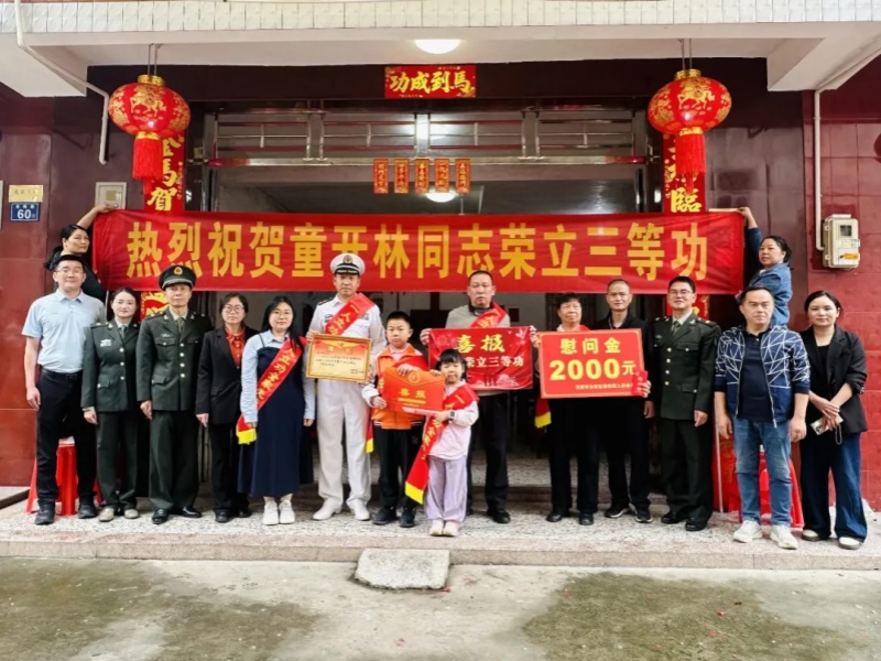 中经联播讯(华新芝 万相荣 通讯员 廖祥忠 江舲)春日喜报传佳音,崇军拥军润人心。4月8日,福建省龙岩市永定区退役军人事务局、区人武部、凤城街道相关负责人组成立功送喜报队伍,带着立功喜报和慰问金,一路锣鼓喧天、喜气洋洋,前往立功现役军人童开林家中,将这份来自军营的荣耀与党和政府的关怀,送到军属手中,让尊崇之光在春日里熠熠生辉。