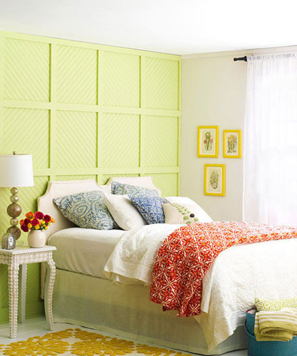 床头板的设计在卧室中起到十分重要的装饰作用,在墙面上通过纹理和边线的巧妙变化,成为独特的墙面装饰。淡淡的绿色床头板,和整个房间的色调搭配得相得益彰。
