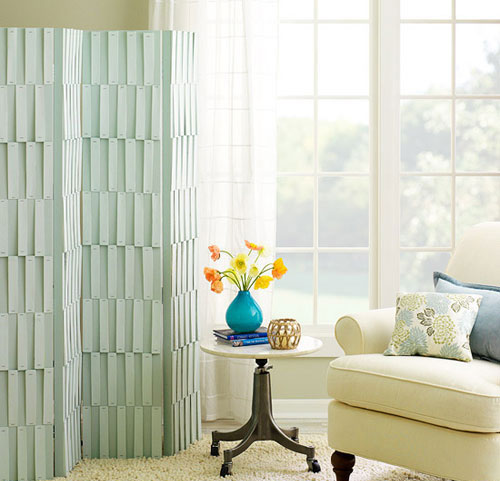 可以利用家中屏风,让它具有独特的变化感,通过垫片将整个屏风都变得具有层次感。淡雅的色调和整个空间的格调都搭配得十分协调。