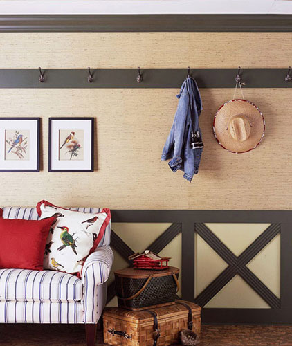 在淡黄色的墙面上,上方的木板作为挂钩而下方则将由深色的木板交叉,成为一个简单的装饰,就让墙面具有了变化感。