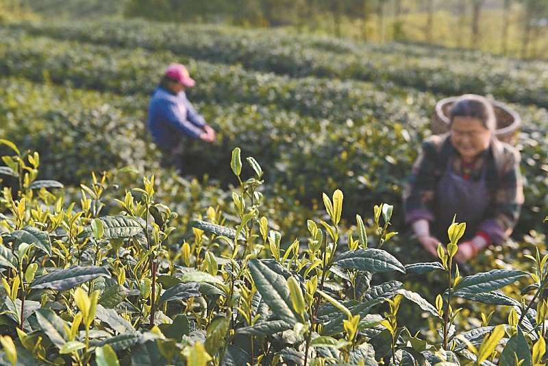绵竹市土门镇困牛山水库赵坡茶园,采茶工在采摘赵坡茶嫩尖