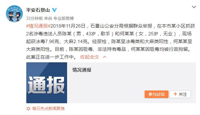 2018年11月26日,石景山公安分局根据群众举报,在本市某小区抓获2名涉毒违法人员陈某(男,43岁,歌手)和何某某(女,25岁,无业),现场起获冰毒7.96克、大麻2.14克。 经尿检,陈某呈冰毒类和大麻类阳性,何某某呈大麻类阳性。目前,陈某因吸毒、非法持有毒品,何某某因吸毒均被行政拘留。此案正在进一步工作中。