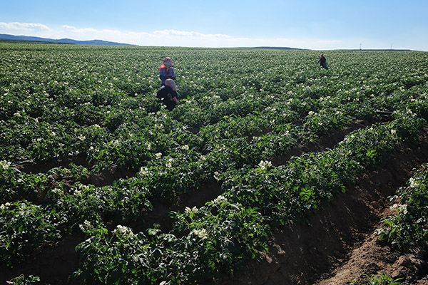 7月19日,在甘肃省定西市安定区香泉镇马铃薯种植基地,农民在进行马铃薯田间管理。