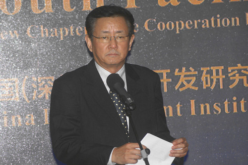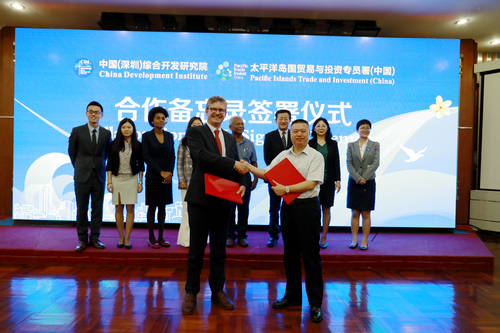 本月13日接近傍晚时分,伴随着来自南太平洋岛国原住民刚劲雄浑的土风舞表演,一场名为“南太平洋之夜-暨CDI&PTI合作备忘录签约仪式”的活动,在中国(深圳)综合开发研究院(CDI)隆重举行。CDI院长樊纲、密克罗尼西亚联邦亚浦州州长托尼·纲吉彦、太平洋岛国贸易与投资专员署(中国)首席代表大卫·莫里斯出席了活动并致辞。