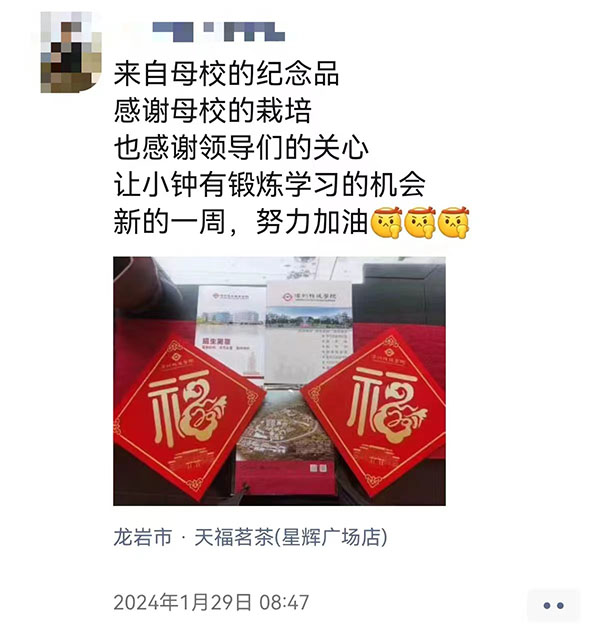 中经联播讯(金向友 庄秋风 林建辉 通讯员 陈步青)龙腾新春蓄势待发,凝心聚力奋发图强。为更好地联络、凝聚和服务校友,实现校友同心聚力、共谋发展。在农历龙年新春来临之际,福建漳州科技职业学院开展了“迎新春、访校友、送祝福”活动。