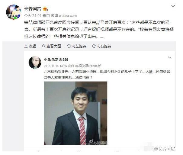 近日,宋喆律师邵亚光接受媒体采访,他首次回应了关于宋喆和马蓉的多种传闻,否认两人开房百次。不过,有网友通过微博扒出疑似宋喆律师邵亚光的相关信息,称邵亚光没有职业道德,和多名当事人有染,不让儿子上学等消息。