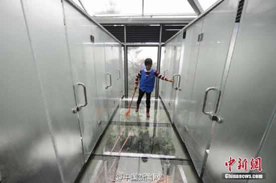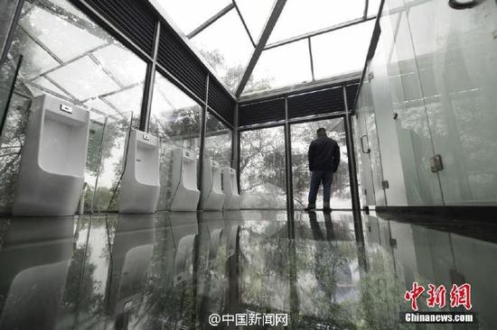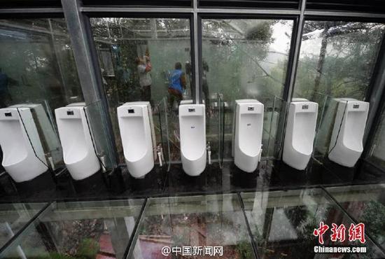 29日,湖南长沙石燕湖全透明玻璃厕所建成对外开放。周边绿树环绕,风景秀丽,全透明厕所吸引了不少游人前来参观。男女厕之间仅隔着一面玻璃,朦胧可见,大多数人没敢体验一番…(记者 杨华峰)网友:愿闻其翔,静观其便。