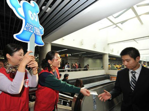 2009年11月25日,60名上海市三八红旗手代表在上海地铁站内参加交通志愿者活动,宣传示范“左行右立”、“先下后上”等文明乘车规范。 新华社发