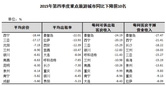 从第四季度各城市经营情况看,平均房价高于全国平均水平343.51元/间夜的有23个城市,位居前10位的分别为三亚、上海、杭州、北京、广州、深圳、厦门、拉萨、苏州、南京;平均出租率高于全国平均水平55.59%的有29个城市,位居前10位的分别为长沙、福州、张家界、南京、深圳、三亚、上海、珠海、厦门、南宁;每间可供出租客房收入高于平均水平190.95元/间夜的有23个城市,位居前10位的分别为三亚、上海、深圳、广州、北京、杭州、厦门、南京、长沙、福州;每间客房平摊营业收入高于全国平均水平37767.47元/间的有22个城市,位居前10位的分别为上海、杭州、温州、无锡、北京、三亚、南京、广州、苏州、厦门。(以上排序城市不包括填报率不足60%的郑州、洛阳两市)