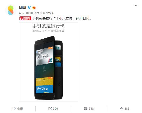 凤凰科技讯 8月30日消息,小米官方微博“MIUI”发布消息称,9月1日小米将举行发布会,与中国银联正式推出“小米支付”(MI Pay)。由此小米成为继苹果、三星后,首家与中国银联达成合作的国产手机厂商,并且也成为全球首家同时支持银行卡和公交卡的手机厂商。