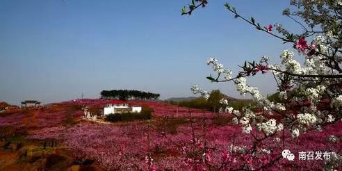 春日里的唐庄村,万亩桃花次第开放,呈现在游客眼前的是满山红遍的桃花盛景和无限醉人的田园风光。