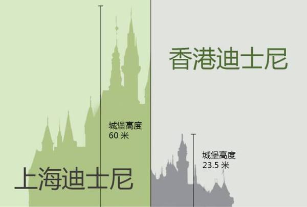 每个迪士尼都有自己的一个城堡,从城堡的高度来比较的话,上海的迪士尼远超香港迪士尼。下图可以很直观的表达出来,不仅是城堡的高度,城堡的大小也是按照比例表示的,明显香港迪士尼的城堡小了不少。