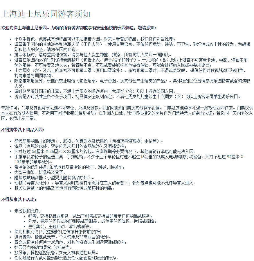 此外,游客还需注意的是,两地乐园的“游客需知”有较大差别,比如上海乐园在着装、携带物品和言行举止都有细致的规定,需提前了解掌握: