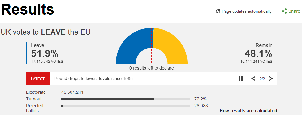英国脱欧真的要成了!英国公投382个投票区已全部公布结果。有约3300万英国选民参加了公投,脱欧派获1741万票,得票率为51.9%。