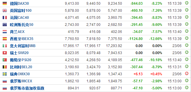 受此影响,全球股市遭到重挫,欧洲避险情绪高涨,英国富时100股指期货延续跌势至10%,报5730点,德国DAX指数期货业跌9%。