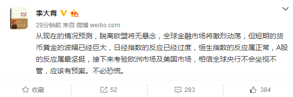 对于脱欧的影响,专家们看法不一,英大证券首席经济学家李大霄今日在微博表示:“英国脱离欧盟将无悬念,全球金融市场将激烈动荡...接下来考验欧洲市场及美国市场,相信全球央行不会坐视不管,应该有预案。不必恐慌。”不过,交银国际洪灏在接受外媒采访时表示,市场对脱欧毫无准备,风险难以量化才最可怕。