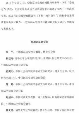 7月4日,万科A复牌第一天便跌停,可华润也没闲着。当天,华润官方微信号称,就在前一天,北京市竞天公诚律师事务所会同北京大学企业与公司法研究中心,邀请国内13位权威法学专家召开了“万科股权争议论证会”,就董事会决议效力、一致行动人等相关法律问题进行了研讨。其中领头的法学专家便是中国政法大学教授江平。