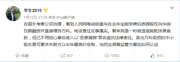 7月12日晚间,万科独董华生发布微博称,“看到人民网等说钜盛华在去年宝能举牌后质押股权向华润巨额融资并直接增持万科。电话查证此事属实。”