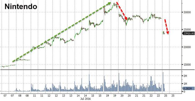 原因是,上周五(7月22日)口袋妖怪(Pokemon Go)日本市场开服之日当晚,该公司发布了一则致投资者信。任天堂在信中坦言道,因任天堂实际持有的Pokemon Go权益有限,所以这款火爆游戏的收入对于任天堂公司的总收益贡献有限。任天堂上周五发表声明后,任天堂美股暴跌16%,今日日本股市开盘后任天堂日股追随美股暴跌。
