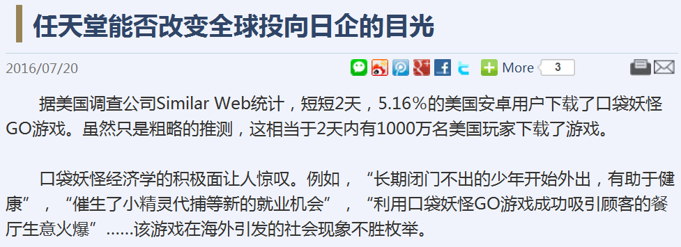 7月20日,《日本经济新闻》发表了一篇文章,对最近火爆的AR(现实增强)游戏口袋妖怪(Pokemon)GO大肆吹捧,称“已经不能再将口袋妖怪GO视为单纯的游戏,而是一种社会现象。”并且,将该现象称为“口袋经济学”。