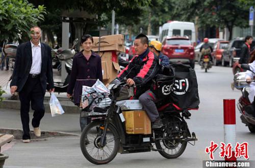 一名快递公司送货员正骑着满载快件的电单车在市区内送货。李俊锋 摄