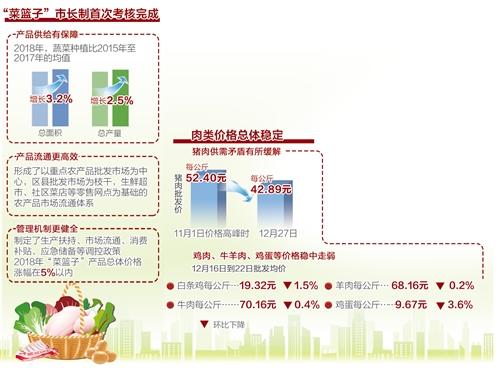 考核显示,“菜篮子”产品供给有保障。36个城市大力支持农业产业发展,2018年,蔬菜种植总面积、总产量比2015年至2017年的均值分别增长3.2%、2.5%。同时,各城市加强肉类产品调运和投放,保证了肉类市场供应。