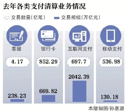 新京报讯 (记者李蕾)中国支付清算协会5月19日发布《中国支付清算行业运行报告》,报告显示,2015年我国商业银行和支付机构处理的互联网支付业务金额共计2042.39万亿元。分析认为,支付业务持续由PC端向移动端迁移。
