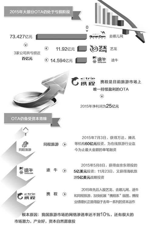 当然,OTA并不差钱。记者梳理发现,2015年7月3日,同程旅游获得万达、腾讯等机构60亿元投资,为在线旅游行业迄今为止最大金额的单笔融资。同年5月8日,途牛获得由京东领投的5亿美元投资;11月23日,途牛又获得海航旅游5亿美元战略投资。