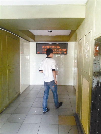 昨日,在被骗者居住的小区单元楼下,北青报记者注意到,入口处的墙上有电子显示屏,屏幕上滚动播放“海淀分局提示您:凡接到陌生人要求转账、汇款的短信或电话,请您做到不听、不信、不汇款、不转账”的信息。同时,小区内其他几栋楼也在楼道内或单元楼外设置了同样的显示屏。“这些电子显示屏今年年初就已经挂上了。”该小区保安解释道。