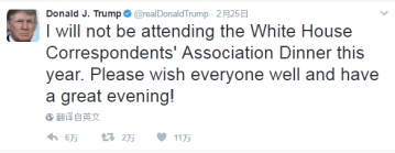 当美国主流媒体因此而愤愤不平时,特朗普25日又来一记重击,宣布将缺席于4月底在华盛顿召开的一年一度美国白宫记者协会招待晚宴。