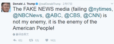 自2015年开始竞选总统以来,特朗普与美国主流媒体之间就打响了旷日持久的“战争”。近日这场相生相克的战争愈演愈烈。一向自诩为“全球标杆”的美国几大主流媒体,被特朗普拒之门外甚至全盘否定。在这场没有硝烟的舆论战中,谁能成为最后的输家?