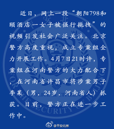 据悉,4月7日21时许,“朝阳798和颐酒店一女子被强行拖拽”案件专案组在河南警方的大力配合下,在河南省许昌市将涉案男子李某(男,24岁,河南省人)抓获。
