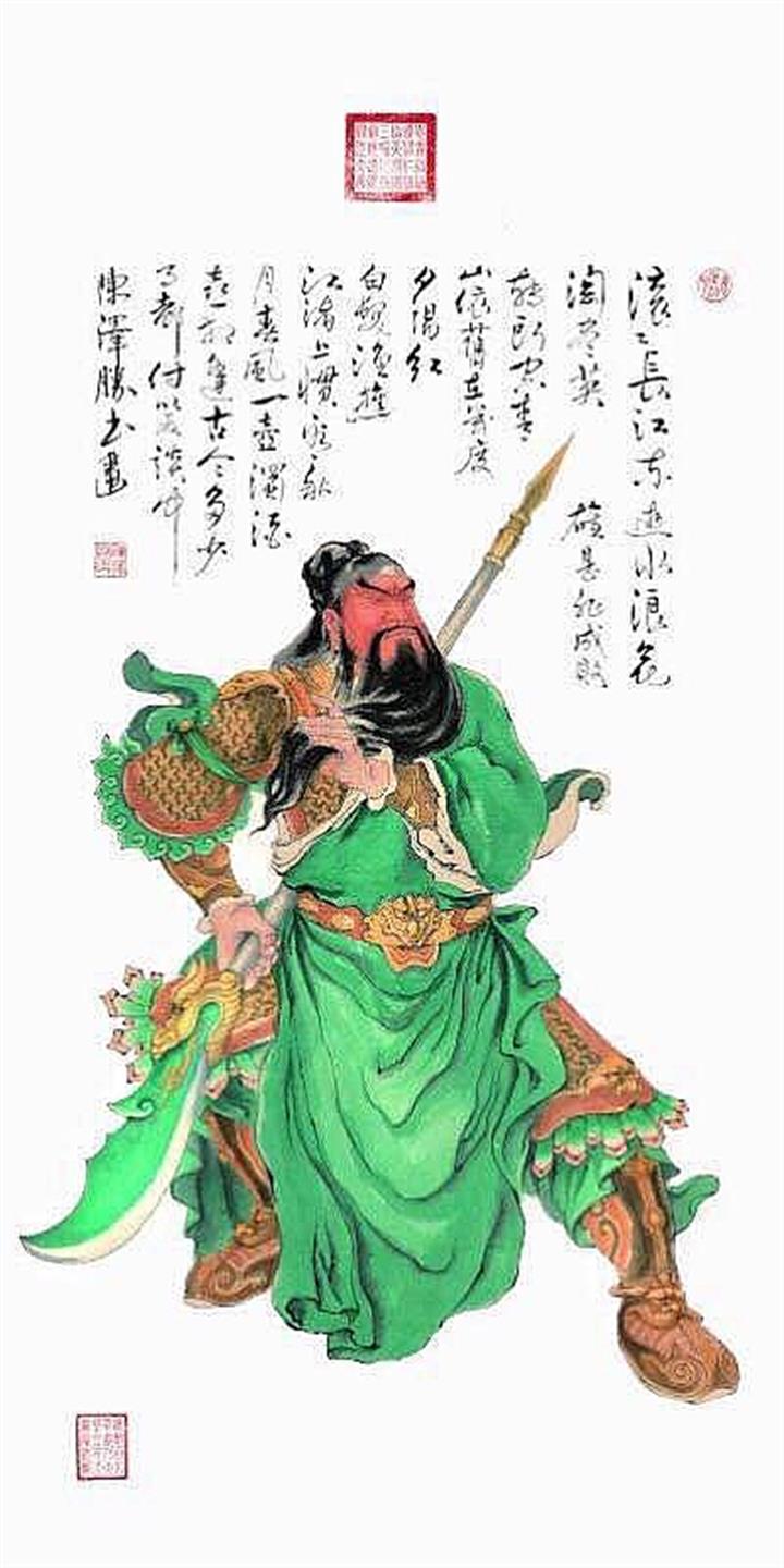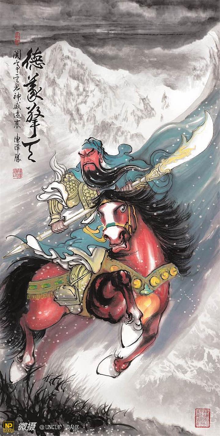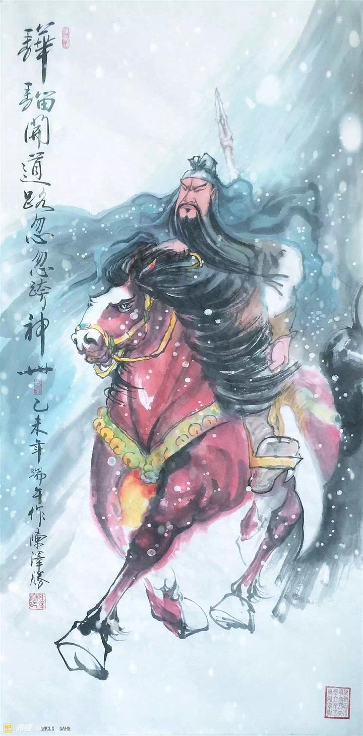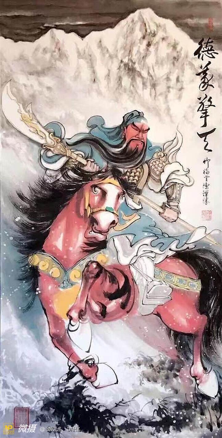 陈泽胜先生是中国当今擅长画关公的画者,作为一名艺术家,画关公不是单纯追求绘画技巧,而是发自内心对关公重德行义高尚精神的崇拜与敬仰。所以,他笔下的关公从来都不是血雨腥风杀伐征战,而是德耀寰宇炳千古,人格立世、德义擎天,止戈为武的武圣!按照中国民间信仰的说法,关公是“真武大帝”,是整个宇宙的护法,近百年关帝更是天上执星宿代行玉帝职能,护佑着天地的和平与安宁。这也启迪我们,什么才叫“真武”?“真武”绝非穷兵黩武,“真武”是不战而屈人之兵的仁义之师、正义之师!