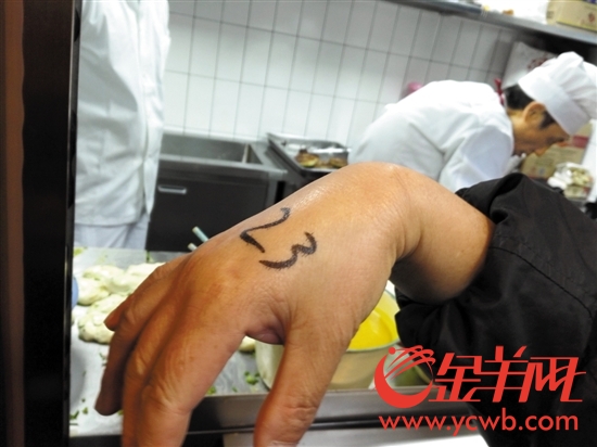 工作人员将号写在食客手上