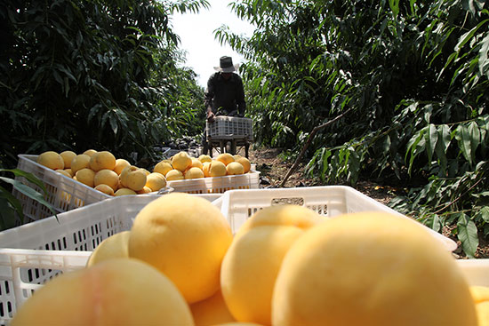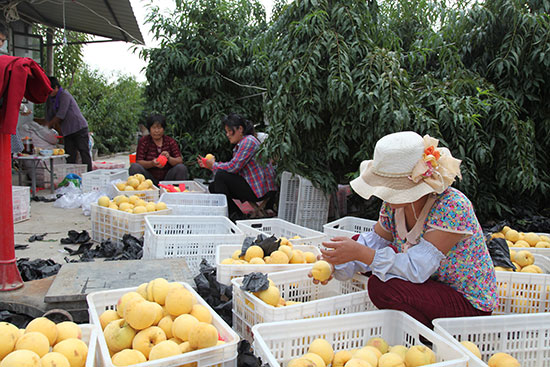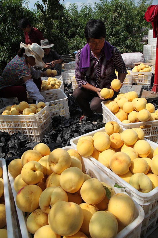 金秋时节,山东省临沂市平邑县地方镇王家洼村晚熟新品“世纪桃王”黄金桃丰收上市供应市场。 晚熟“世纪桃王”黄金桃,具有果实个大(平均单果重400克、大果630克)、色泽金黄、果肉致密硬脆、口味甘甜、耐储运、采收30天后仍可切片等特点,因品优价高,亩增加农民收入达1万多元。图为村民在采摘装箱销售“世纪桃王”黄金桃。