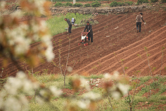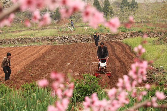 阳春四月,山东省沂蒙山区平邑县满山遍野的梨、桃、苹果等果树花开绽放,劳作的人们穿梭于花海间春耕、春管等春季农业生产,田间山野呈现出一派生态美景。
