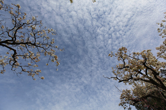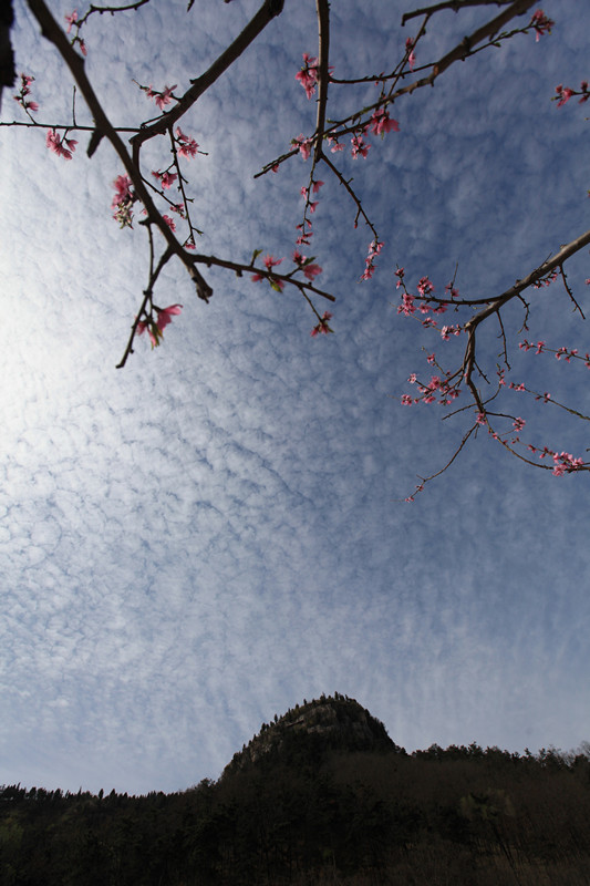当日清晨,山东省临沂市平邑县九间棚景区上空出现鱼鳞云景观,朵朵云彩在阳春蓝天和梨花、桃花的映衬下,美不胜收。