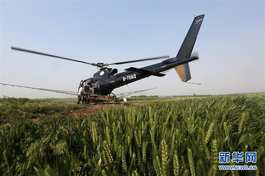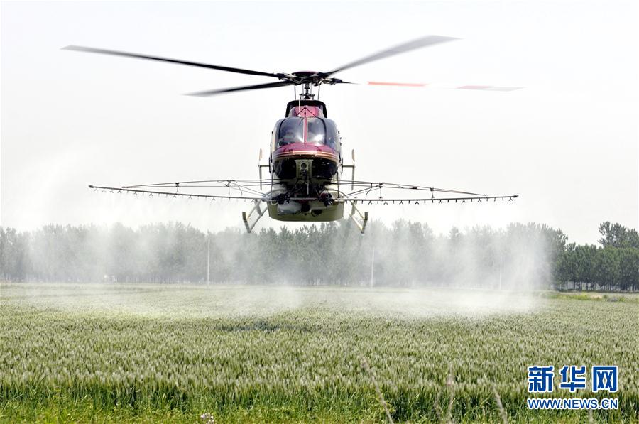 5月12日,一架直升机在山东省临沂市郯城县马头镇良种小麦种植基地上空施药防治病虫害。