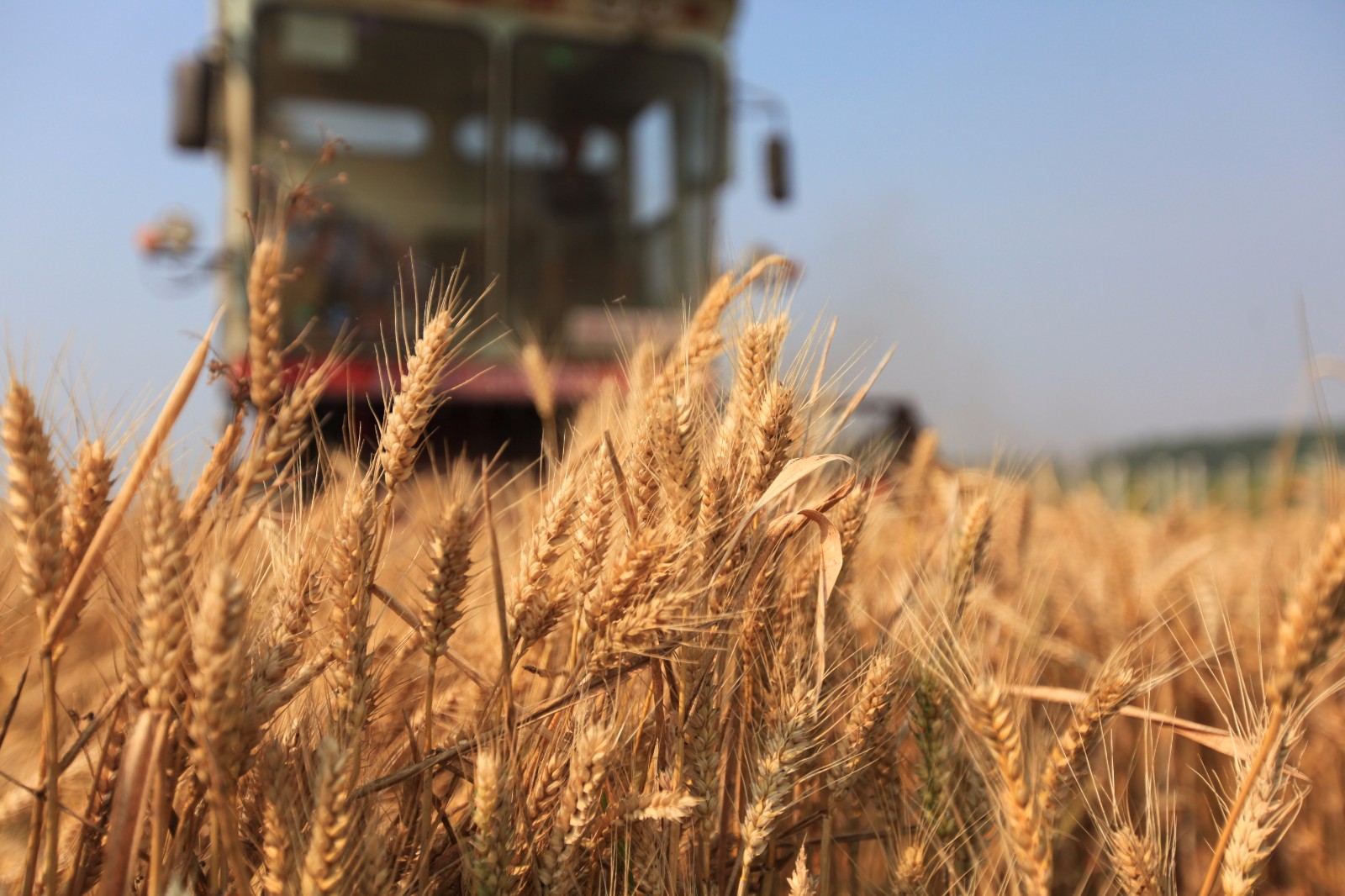 6月11日,收割机在山东省临沂市平邑县地方镇农田里收割小麦。据山东省农机局发布的消息,山东小麦收获进入尾声,玉米机播过八成。截至6月14日下午4点,全省日收获小麦208万亩,累计收获小麦5494万亩,占应收面积的95.3%。武纪全摄