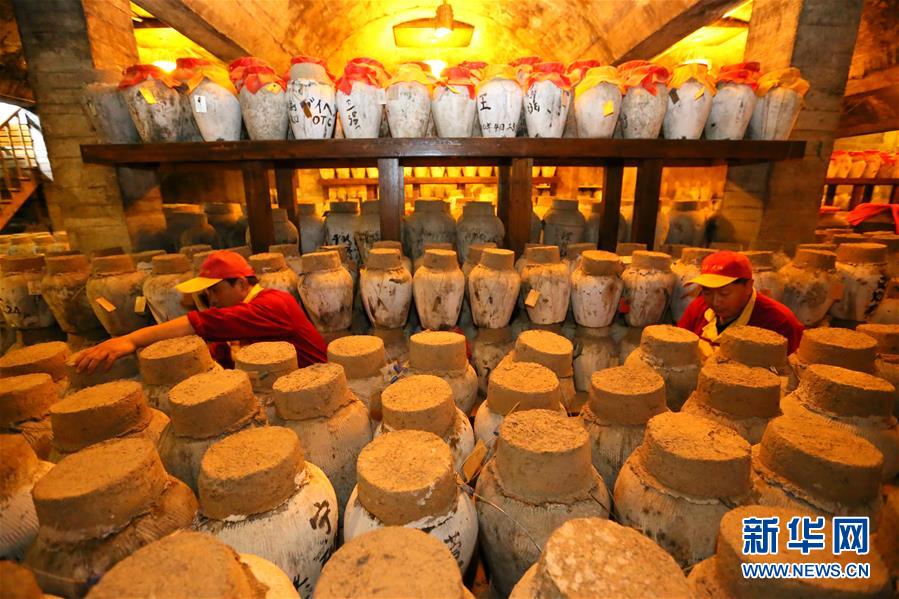 11月15日,山东即墨黄酒厂的工人在储存封坛的老酒。初冬时节,被列入省级非物质文化遗产名录的山东即墨老酒迎来酿造和销售旺季,当地老酒企业的工人们生产、包装、运送产品,十分忙碌。新华社发(梁孝鹏 摄)