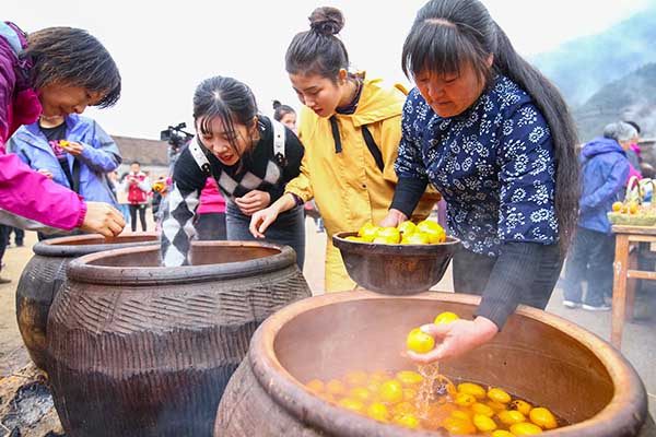 11月19日,游客在蒙山人家景区体验柿子脱涩过程。