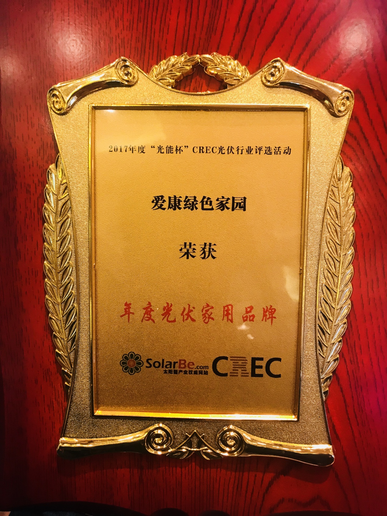 2017年11月1日,由solarbe索比光伏网和无锡贸促会共同主办的第二届光伏创新发展推动论坛暨CREC光能杯颁奖典礼在无锡君来世尊酒店盛大举行,作为中国领先的户用分布式企业,江苏爱康绿色家园科技有限公司(以下简称“爱康绿色家园”)荣获年度家用光伏品牌大奖并应邀出席颁奖典礼。