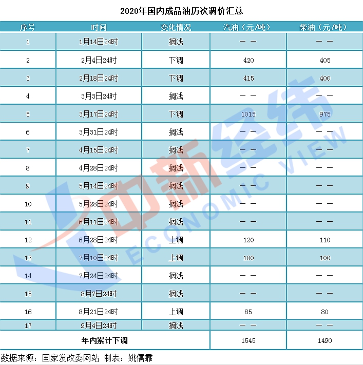 据中新经纬客户端统计,2020年以来国内成品油调价已进行了十七轮,具体为上调三次、下调三次,搁浅十一次,汽油总计下调了1545元/吨,柴油总计下调了1490元/吨。其中,3月31日至6月11日的6轮调整均因国际市场原油价格低于40美元/桶而搁浅。如果本轮成品油调价下调,2020年国内成品油调价将呈现“三涨四跌十一搁浅”的格局。